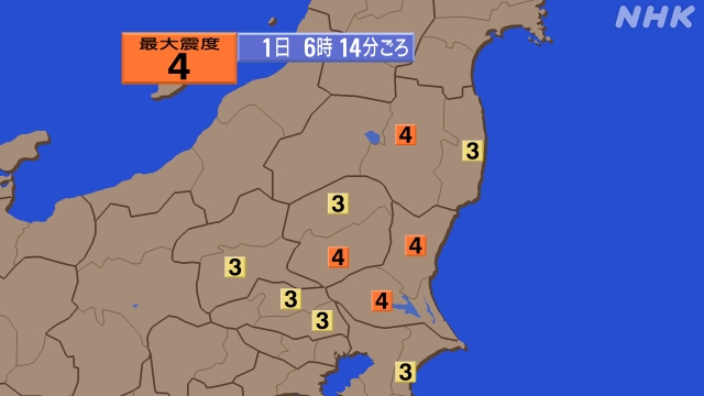 茨城県などで震度4 先ほど午前6時14分頃、茨城県・福島県・栃木県で震度4を観測する地震がありました。この地震による津波の心配はありません。