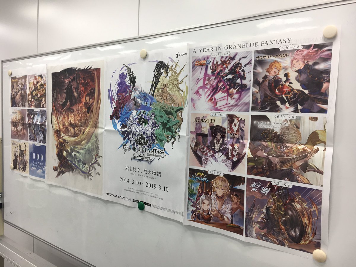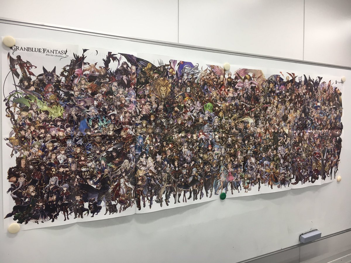 #グラブル 5周年おめでとうございます!編集部に届いたでっかい記念紙を、会議室に貼り出してみました。推しキャラを探すのも一苦労なこの密度!歴史を感じます(ムックどこ…)