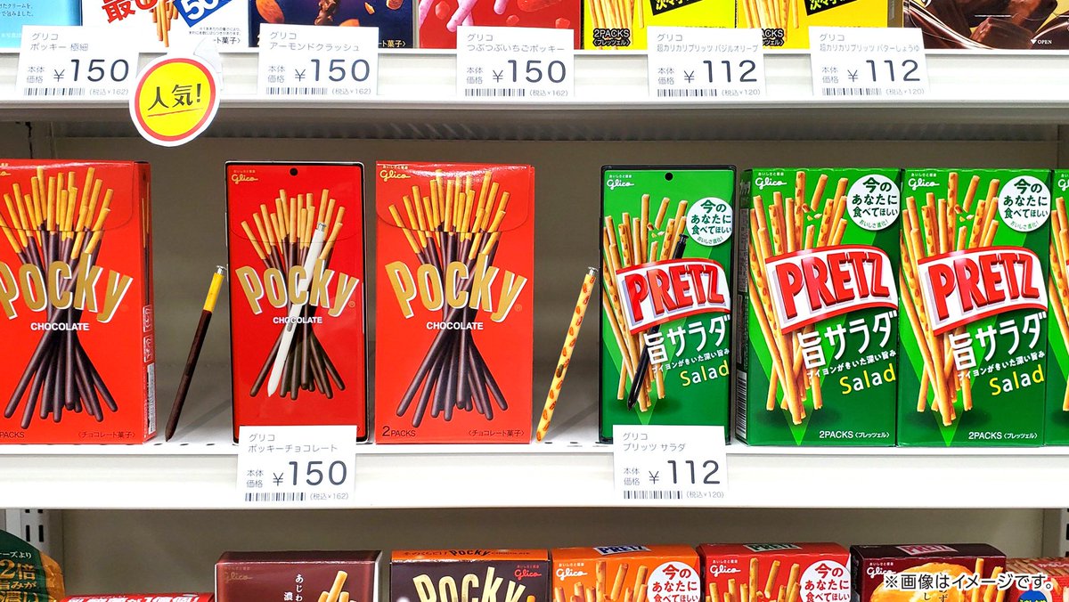 #ポッキープリッツの日 なのでコンビニに来たのですが、Sペンがどこかに行ってしまいました。 この棚のどこかにあるはずなので、見つけた方はRTしてください…? #ポッキーの日 #プリッツの日 #GalaxyN