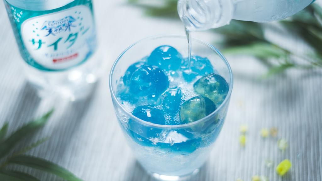 \今日は #七夕/ 天の川?をイメージして九龍玉を作りました。 シロップと寒天で固めた九龍玉に、 しゅわっと天然水サイダーをかけて召し上がれ✨ ぜひお試しください♪