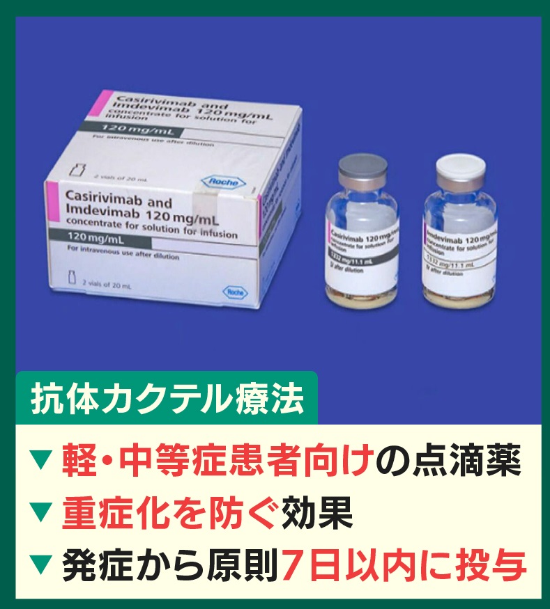 抗体カクテル療法とは、軽・中等症患者向けの点滴薬で、重症化を防ぐ効果があり、発症から原則7日以内に投与することが効果的とされています。