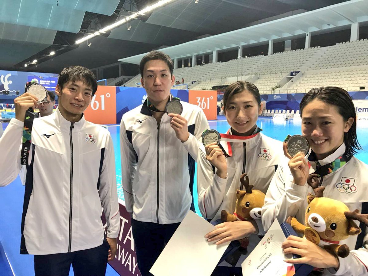 #アジア大会 第5日(22日) #競泳 混合4x100mメドレーリレーで銀メダルを獲得した(左から)入江陵介選手、小関也朱篤選手、池江璃花子選手、青木智美選手です! #がんばれニッポン #A