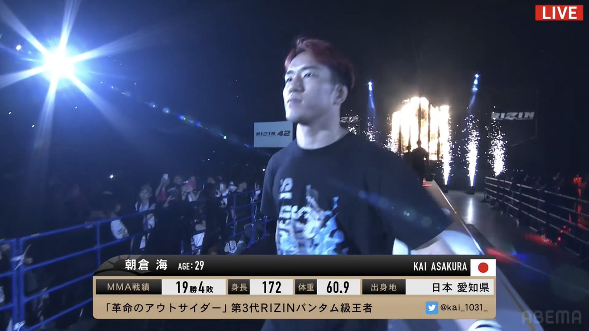 MMA速報です??? #RIZIN42 バンタム級 朝倉海、ボディへのヒザ蹴りで元谷友貴に3R KO勝ち! 29歳 20-4 12KO 3SUB(RIZIN12-3)