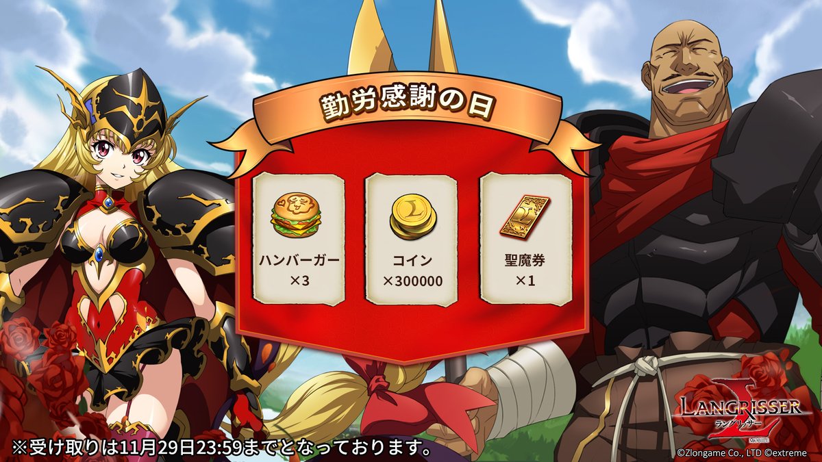 本日は勤労感謝の日です? 勤労感謝の日を記念して、指揮官の皆様にハンバーガー×3、30万コイン、聖魔券をプレゼント致します? ランモバ界でも勤労感謝は行われているのでしょうか