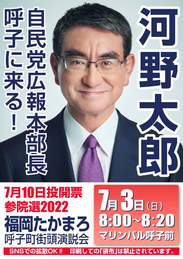 河野太郎さんが日曜の朝、福岡資麿さんの応援で呼子に来ます。 呼子朝市の観光??と合わせて、街頭演説を聞きに来て下さい! #河野太郎 #福岡資麿 #福岡たかまろ #参院選佐賀選挙区