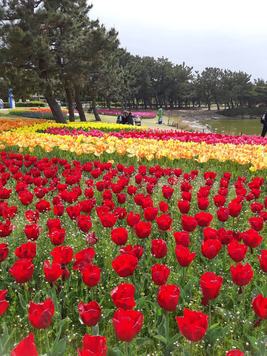 色のコントラストが美しい✨ 撮影場所:虹の花壇(最寄入口:西サイクリングセンター口、西口) ?撮影日:4月2日 #うみなか開花情報 #チューリップ