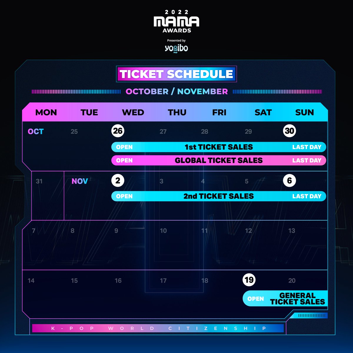 2022 MAMA AWARDS TICKET CALENDAR?️ チケットの詳細日程大公開!今すぐφ(..)メモメモ 2022 MAMA AWARDSで会いましょう! *スケジュールは事情により変更になる可能性があります。