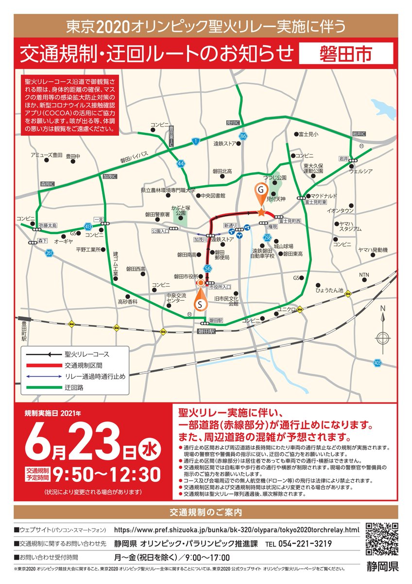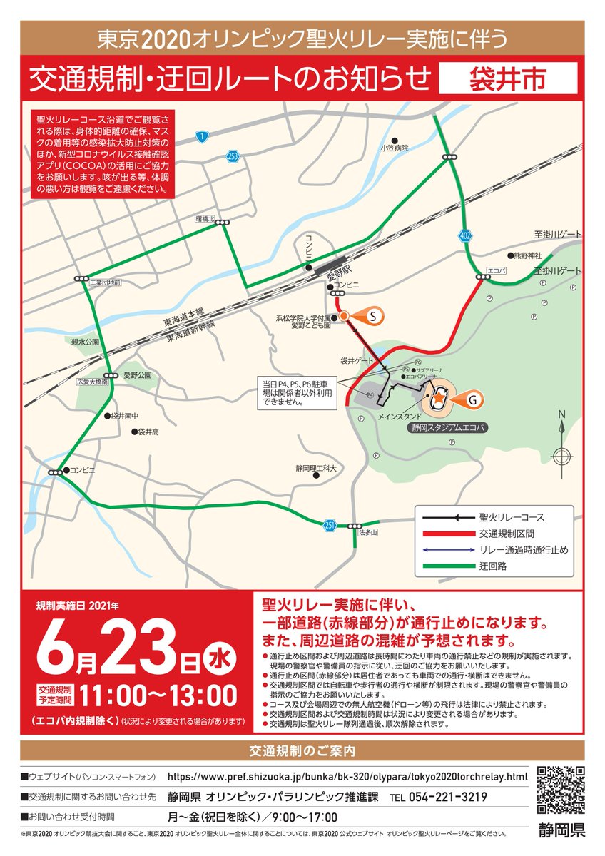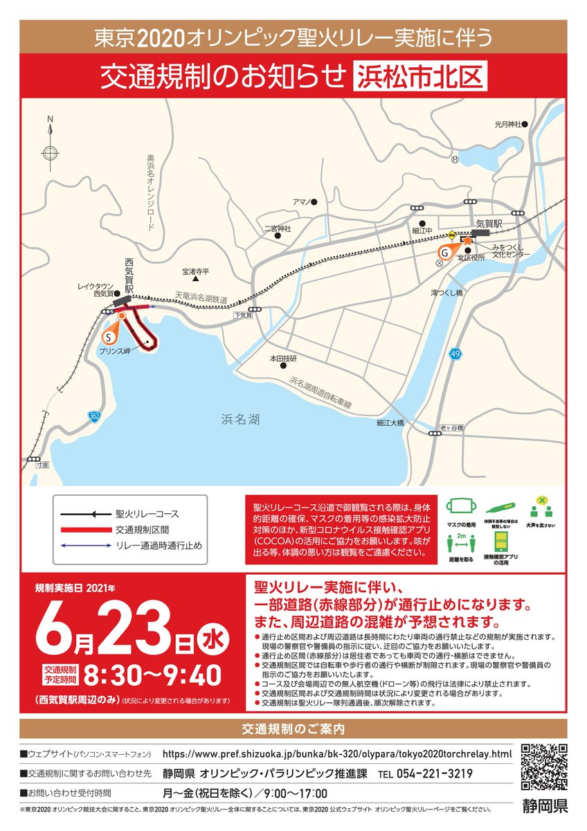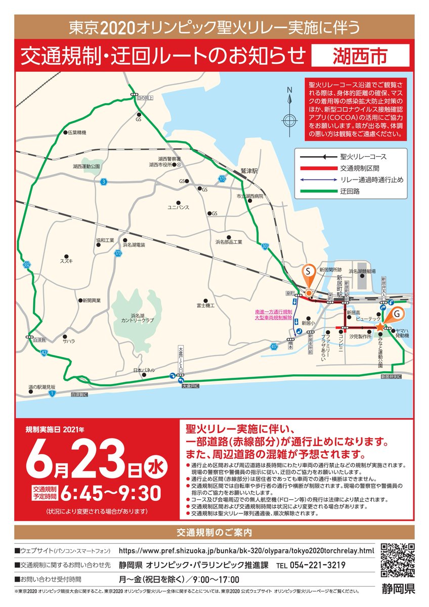 明日23日(水)、湖西市から静岡市葵区にかけての県西部・中部で #聖火リレー が開催されます。(1/2) コース・ #交通規制 の詳細・問合せは、静岡県ホームページをご確認ください。