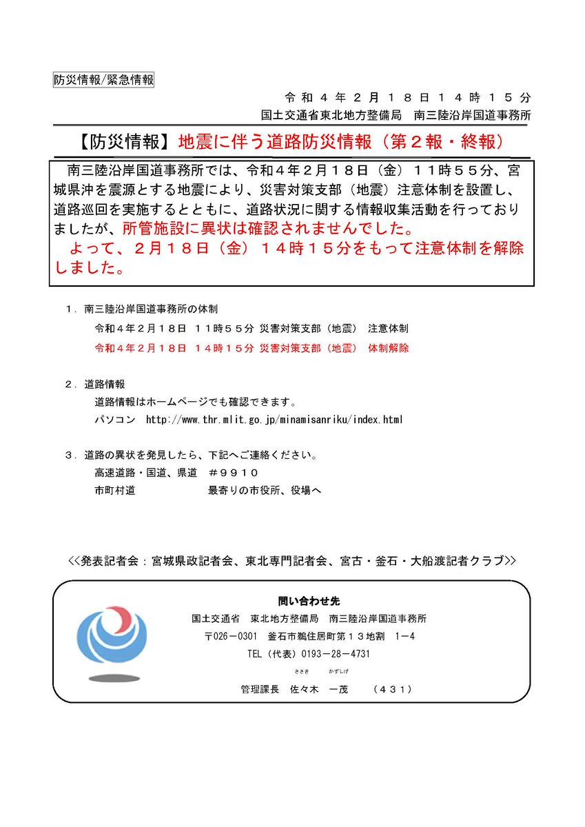 【地震に伴う道路防災情報】 宮城県沖を震源とする地震により、災害対策支部(地震)注意体制を設置しておりましたが、所管施設に異常が確認されなかったため14:15をもって注意体制を解除しました。 #地震