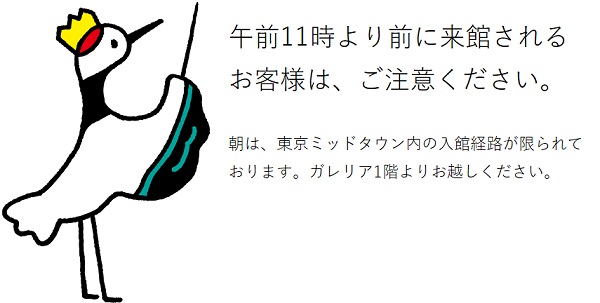 \午前11時までのご来館時の入館経路/ サントリー美術館のある六本木・東京ミッドタウン内は、朝の時間帯、入館経路が限られています。どうぞご注意ください。詳細はこちらをご確認ください→