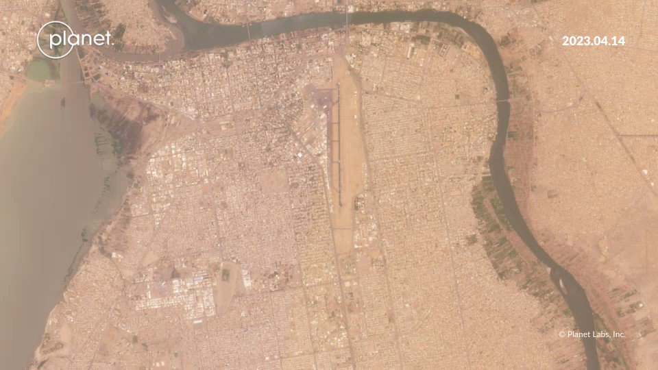 4月14日〜21日,スーダン・ハルツーム空港周辺の衛星画像タイムラプス。空港周辺の建物・大学病院などから煙が上がっています。21日から3日間の停戦呼びかけ後も戦闘が続いています。