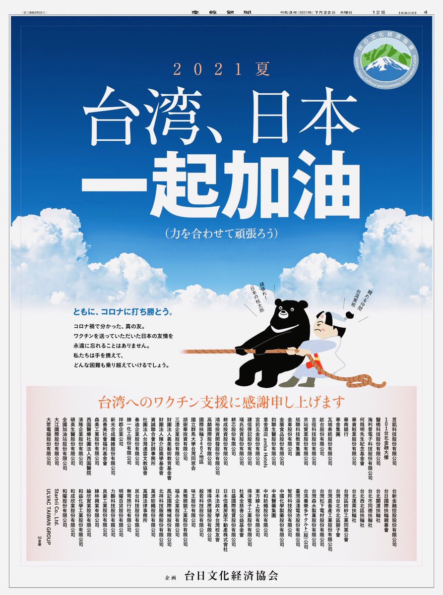 東京オリンピックの開幕式前日となった22日、日本の産経新聞に台湾の88の企業や団体が名を連ねた一面広告が掲載された。台日文化経済協会(台北市)の呼びかけで実現した。(台日経済文化協会、産経新聞提供)
