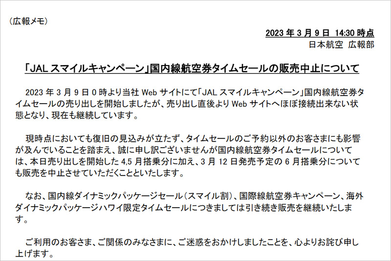JALが国内線航空券タイムセール中止を決定。Webサイトの復旧見込み立たず