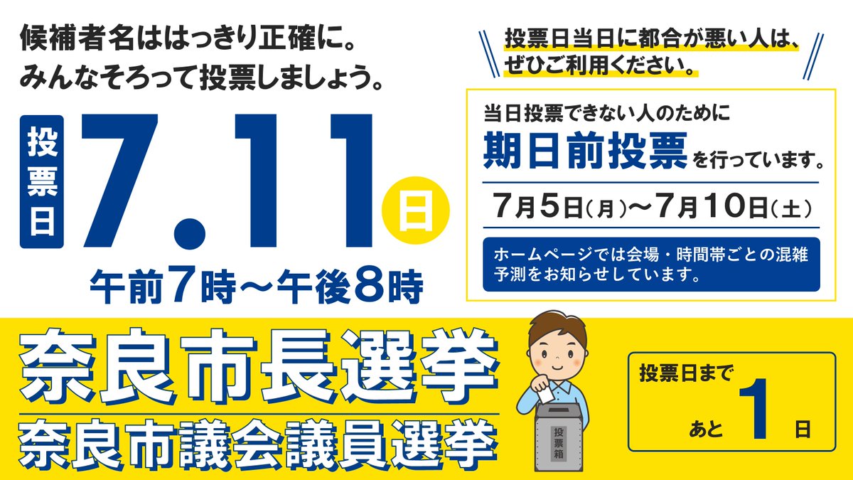 【7月11日(日)は奈良市長選挙・奈良市議会議員選挙】 / 投票日まで、あと1日! 本日も期日前投票を受け付けています! \ ▼期日前投票:本日午後8時まで