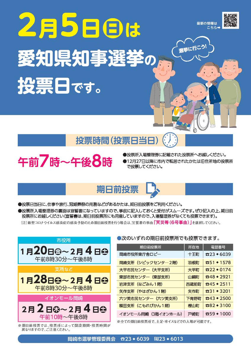 明日、2月5日(日)は愛知県知事選挙の投票日! 投票日に都合の悪いかたは、期日前投票をご利用ください。 詳しくは、こちら↓