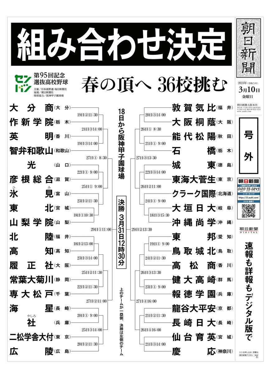 第95回記念選抜高校野球大会の組み合わせが決まりました。3月18日開幕です。