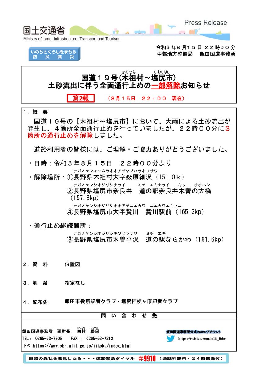 【通行止め解除】8月15日から実施していました #国道19号 長野県木祖村~長野県塩尻市の通行止めにつきましては、8月15日22時00分をもって解除しました。ご協力いただき、ありがとうございました。 #道路情報 #大雨情報