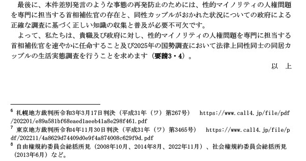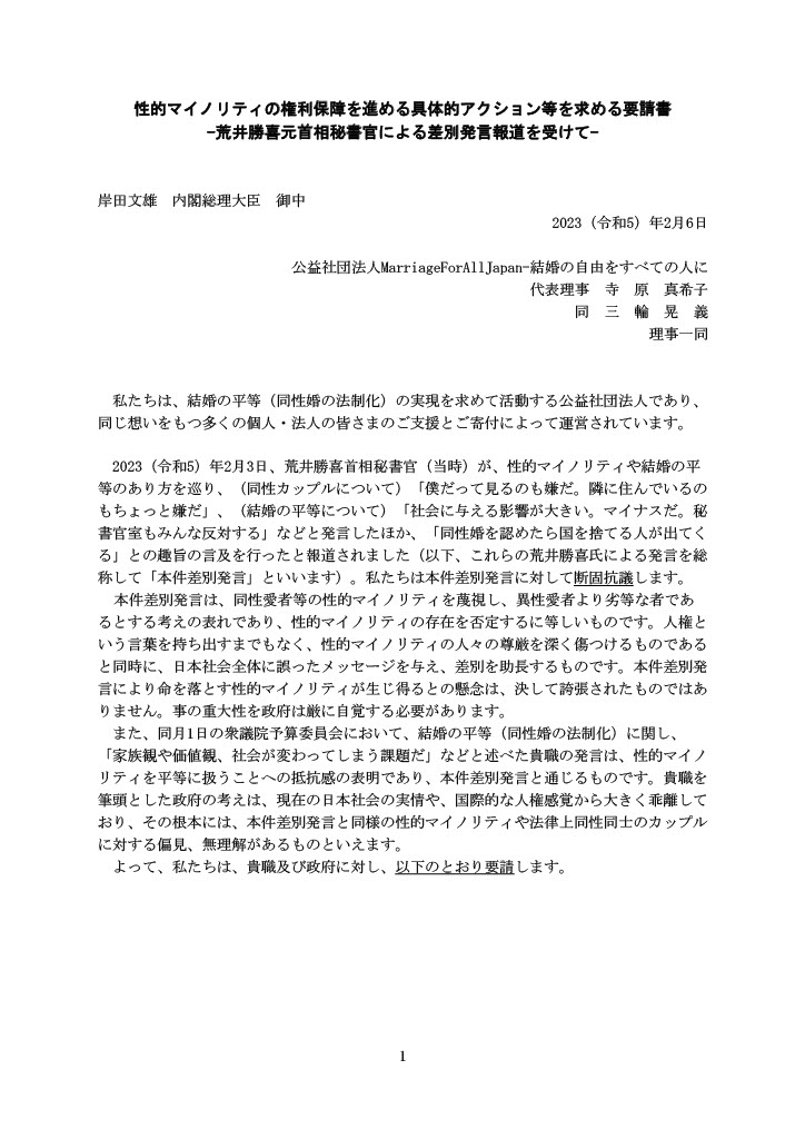 岸田文雄首相宛「性的マイノリティの権利保障を進める具体的アクション等を求める要請書-荒井勝喜元首相秘書官による差別発言報道を受けて-」(作成:Marriage F